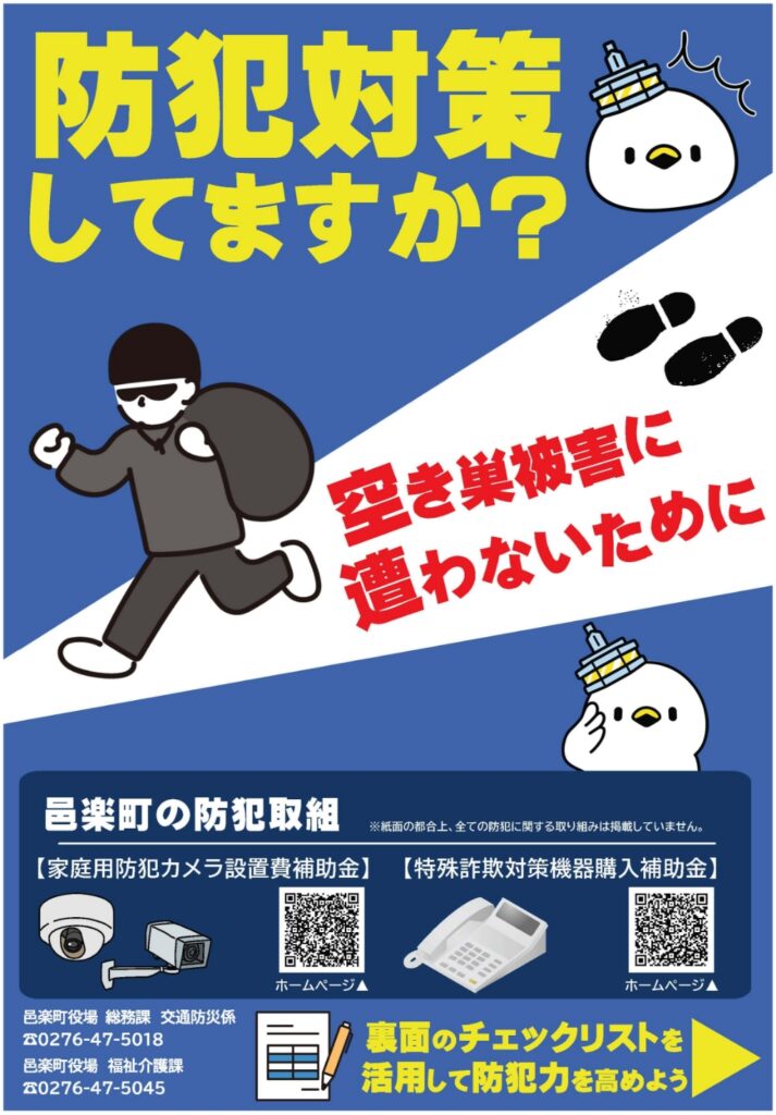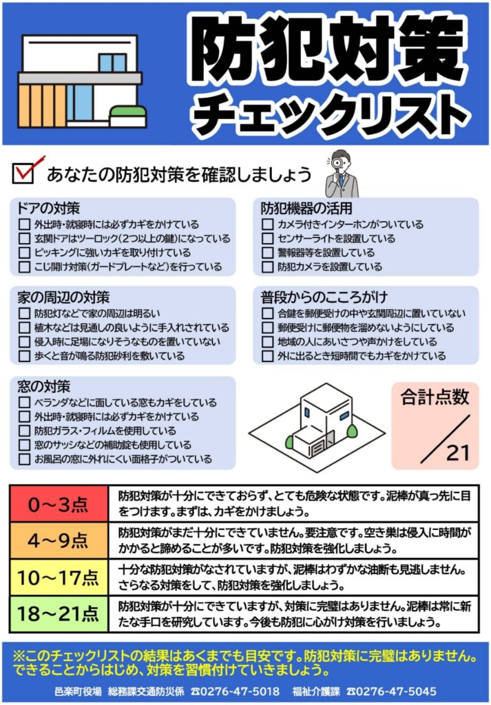 空き巣に「狙われやすい家」ならないために!防犯チェックリストと安全ステッカー配布中 2026.02.27 大泉警察署管内で空き巣被害が報告されています。窓や玄関の施錠だけでなく、ちょっとした油断が狙われることがあるため、日常の行動を見直しましょう。防犯チェックリストでは、「ドア対策」「家の周辺の対策」「窓の対策」「防犯機器の活用」「普段からの心がけ」などお家の防犯について21個の項目を確認できるリストです。空き巣被害に遭わないために、是非ご活用下さい。 地域包括ケア推進係 ★窓口の場所:役場庁舎1階4番窓口 ★直通電話:☎0276-47-5045